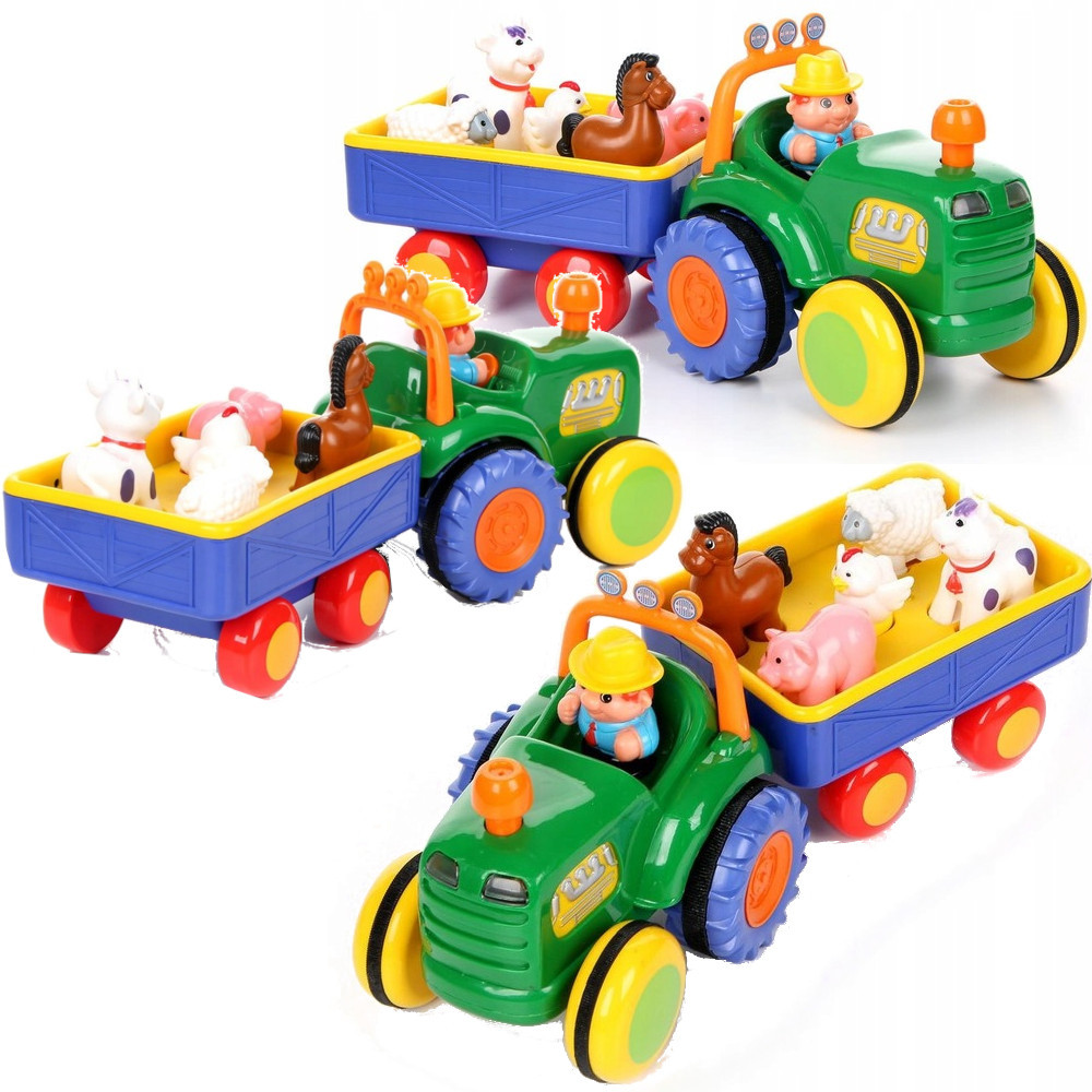 Po naciśnięciu komina traktor przez chwilę samodzielnie jedzie do przodu wydając realistyczny odgłos silnika. Kiedy natomiast dziecko wciśnie fotel kierowcy rozlegnie się dźwięk melodyjki "Farmer". Dla jeszcze większej zabawy kierownica wydaje dźwięk klaksonu, a przednie światełka mrugają. Dziecko umieszczając figurki na przyczepie ćwiczy precyzję oraz zdolność manualną rąk. Wesołe rymowanki przybliżą mu charakterystykę popularnych zwierząt domowych.