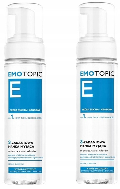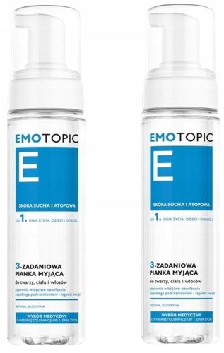 EMOTOPIC 3 Zadaniowa pianka myjąca do twarzy, włosów i ciała. 3-zadaniowa pianka myjąca do twarzy, ciała i włosów, dokładnie i delikatnie oczyszcza skórę i włosy z zanieczyszczeń, nie naruszając hydrolipidowej bariery naskórka. Aktywny biologicznie D-pantenol i betaina zapewniają optymalne nawilżenie skóry głowy, tworząc naturalną osłonę przed podrażnieniami oraz nadmiernym przesuszeniem i łuszczeniem. Szampon zmniejsza świąd i zapobiega tworzeniu się nawracającej suchości skóry głowy. Ekstrakt z rumianku zmniejsza tendencję do nadwrażliwości na czynniki zewnętrzne, jednocześnie regeneruje skórę i wzmacnia włosy. Szampon koi i łagodzi podrażnienia skóry głowy. Wyjątkowo łagodna baza myjąca nie szczypie w oczy. Szampon nie obciąża włosów, ułatwia ich rozczesywanie oraz pozostawia je miękkie i jedwabiste w dotyku.