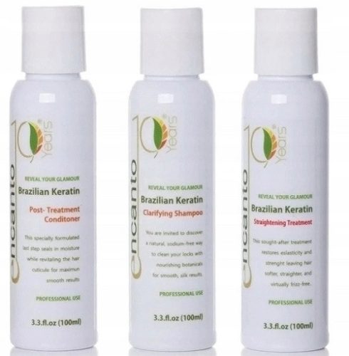 Umyj dokładnie włosy szamponem dołączonym do zestawu (Encanto CLARIFYING SHAMPOO) 2-3 razy w zależności od potrzeby. Celem jest wypłukanie wszelkich pozostałości po koloryzacji lub innych zanieczyszczeniach. Osusz włosy ręcznikiem, usuwając z nich nadmiar wody tak aby pozostały wilgotne.Upewnij się, że jesteś w dobrze wentylowanym pomieszczeniu. Załóż rękawiczki i maseczkę. Dobrze wstrząśnij butelkę (Encanto BRAZILIAN KERATIN) a następnie wyciśnij do miseczki pożądaną ilość preparatu.Przed zabiegiem zrób próbę uczuleniową, nałóż keratynę na mały fragment skóry. Jeżeli skóra nie zaczerwieni się po 5min kontynuuj zabieg.Podziel włosy na bardzo małe partie a następnie za pomocą pędzelka rozprowadź preparat prostujący na pasma w odległości 1-2 cm od skóry głowy. Unikaj bezpośredniego kontaktu preparatu ze skórą głowy.Po nałożeniu produktu na całe włosy odczekaj 15min w temperaturze pokojowej.Wysusz włosy suszarką o średnim nadmuchu, aż do całkowitego wysuszenia (jeżeli masz wrażliwe oczy przytrzymaj ręcznik przy twarzy podczas suszenia).Wyprostuj pasma włosów za pomocą prostownicy która się nagrzewa do temperatury dopasowanej do rodzaju TWOICH włosów. ok 6-7 razy każde.Po wyprostowaniu wszystkich włosów odczekaj 30 minut.Umyj włosy ponownie szamponem (Encanto CLARIFYING SHAMPO). Osusz je ręcznikiem, usuwając z nich nadmiar wody, tak aby były wilgotne.Za pomocą pędzelka do aplikacji zacznij nakładanie odżywki (Encanto TREATMENT) dzieląc włosy na małe pasma. Nakładaj preparat w odległości 1-2 cm. Od skóry głowy, aż po same końce. Unikaj kontaktu preparatu ze skórą głowy. Gdy pokryjesz produktem całe włosy, odczekaj 15 minut i spłucz włosy wodą, pozostawiając na włosach około 50% odżywki.Wysusz włosy suszarką, rozdzielając je na małe pasemka w celu ułatwienia sobie tej czynności oraz poprawienia dokładności suszenia. Następnie wyprostuj włosy prostownicą która się nagrzewa do temperatury dopasowanej do rodzaju TWOICH włosów 6-7 razy każde pasmo.