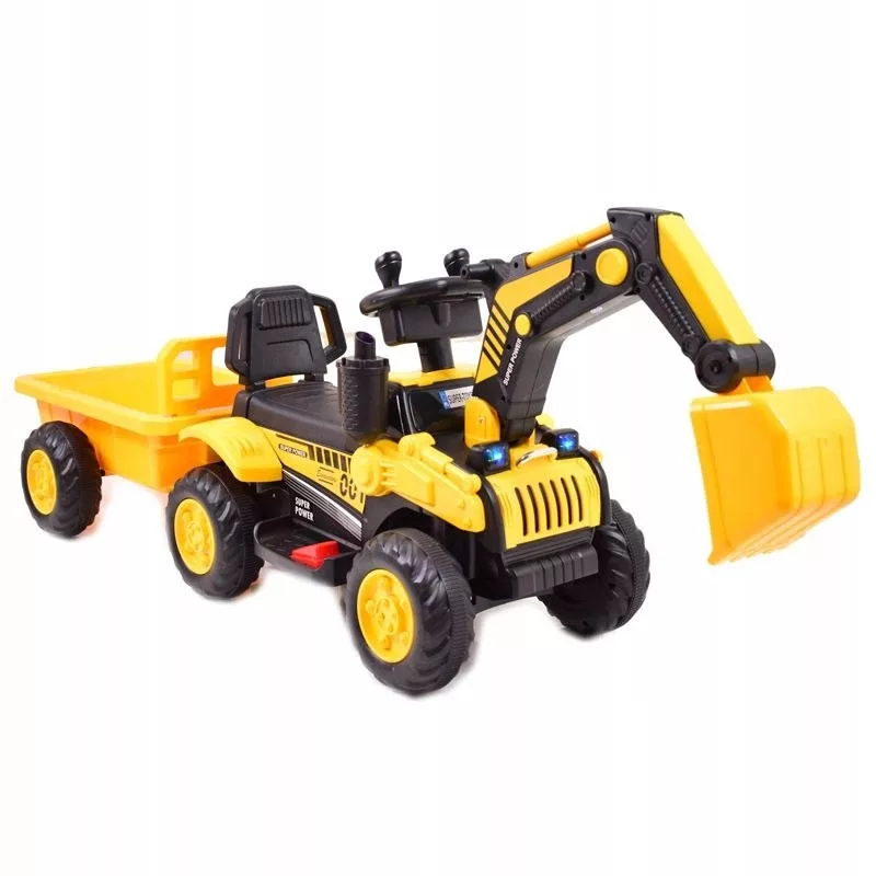 KOPARKA NA AKUMULATOR z ruchomą elektryczną łyżką - możliwość jazdy pojazdem za pomocą silnika napędowego oraz sterowania łyżką/góra dół+ dalej/bliżej Pojazd posiada nowoczenego pilota dzięki któremu mozemy sterować wszystkimi funkcjami pojazdu.
