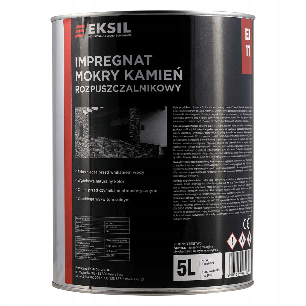 Środek do impregnacji do kamienia naturalnego na bazie najwyższej jakości żywicy akrylowej o działaniu wzmacniającym i ochronnym. EI 11 to impregnat rozpuszczalnikowy z efektem: „mokrego kamienia”. Wyrób dostępny w postaci bezbarwnego, transparentnego płynu. Spełnia wymagania PN – EN 1504-2 dla impregnacji.