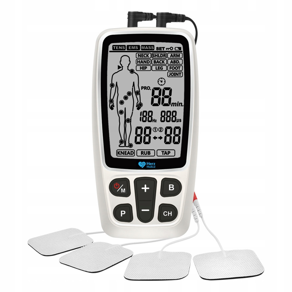 Urządzenie Herz Medical Instruments oferuje aż 30 programów TENS podzielonych na 10 obszarów ciała (po 3 programy w tym jeden konfigurowalny). Najlepiej zacząć od dowolnego programu przewidzianego dla wybranego obszaru ciała i sprawdzić, który okaże się najbardziej skuteczny w walce z bólem. Przy dłuższej terapii należy co jakiś czas zmieniać program, aby organizm nie przyzwyczajał się do tego bodźca.