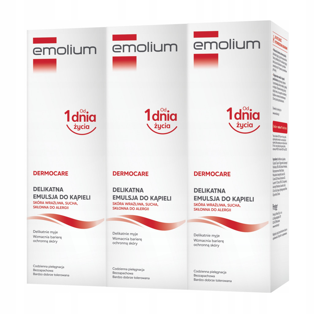 Emolium Dermocare Emulsję do kąpieli stworzyliśmy specjalnie z myślą o codziennych potrzebach skóry wrażliwej i wymagającej już od 1. dnia życia. Zapewnia skórze nawilżenie i jak najlepszą ochronę, poprzez odbudowę i wzmocnienie naturalnej bariery lipidowej.