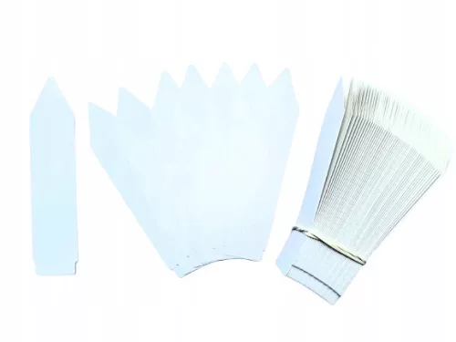 Etykiety wtykane z wytrzymałego materiału do oznaczenia roślin w doniczkach i skrzynkach oraz sadzonek w multiplatach. Strzałki przeznaczone są do oznaczenia rośliny poprzez umieszczenie etykiety w ziemi. Zakończona jednostronnie tzw. "strzałką", by łatwo ją było pionowo wbić w podłoże. Nie zawiera kleju. Zalety produktu: Łatwa i wygodna w użyciu - wystarczy oderwać etykietę od pozostałych i wetknąć ją w podłoże. Wysoce odporna na warunki atmosferyczne. Do stosowania w warunkach zewnętrznych i wewnętrznych. Idealna do opisania długopisem, ołówkiem, markerem lub do zadrukowania w drukarce termotransferowej. Etykieta wtykana jako wizytówka rośliny Etykieta wtykana jest wygodną formą oznaczenia rośliny. Wymiary etykiety pozwalają zawrzeć na niej wszystkie, niezbędne do opisania rośliny informacje: nazwę polską, nazwę łacińską, kod produktu, cenę a także warunki pielęgnacji a nawet logo szkółki.