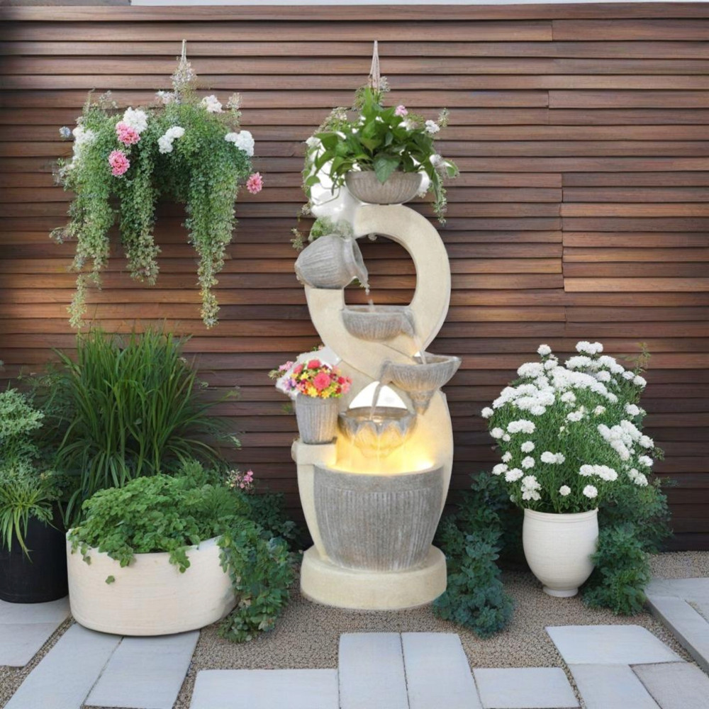 Fontanna w obiegu zamkniętym, woda w dolnym zbiorniku pompowana do górnego naczynia skąd kaskadowo – pod wpływem grawitacji spływa w dół …….. tu tego nie słychać ale jest to miłe i przyjemne doznanie zamykające oczy – można odczuć wrażenie przebywania blisko naturalnego strumienia ,
