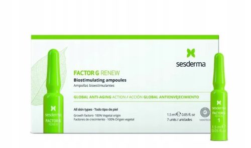 Sesderma Factor G Renew ampułki biostymulujące, 7 x 1,5 ml to siedmiodniowa, intensywna kuracja przeciwzmarszczkowa, odmładzająca i ujędrniająca. Każda ampułka zawiera inną kompozycję składników aktywnych, aby kompleksowo zadbać o Twoją skórę.