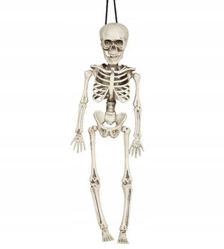 Trójwymiarowy szkielet człowieka do dekoracji na Halloween. Szkielet jest anatomicznie odwzorowany, z wyraźnymi kośćmi, takimi jak czaszka, żebra, miednica i kończyny. Szkielet wykonany z tworzywa, posiada ruchome nogi, głowę oraz żuchwę dzięki czemu można nadać mu inną pozycję, np siedzącą.