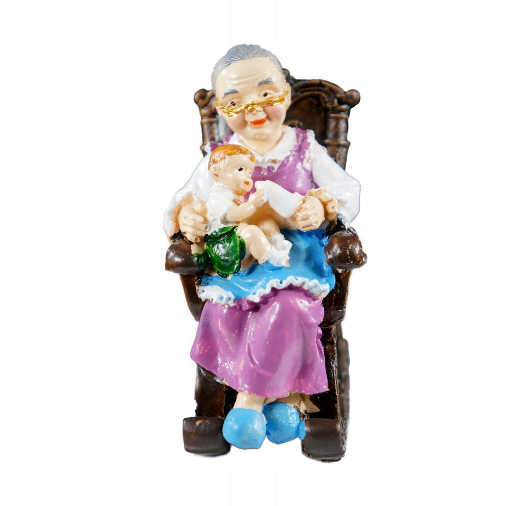 Figurka z tworzywa przedstawiająca babcię w bujanym fotelu karmiącą dziecko butelką. Uwagę przykuwa dekoracyjny antyczny fotel.