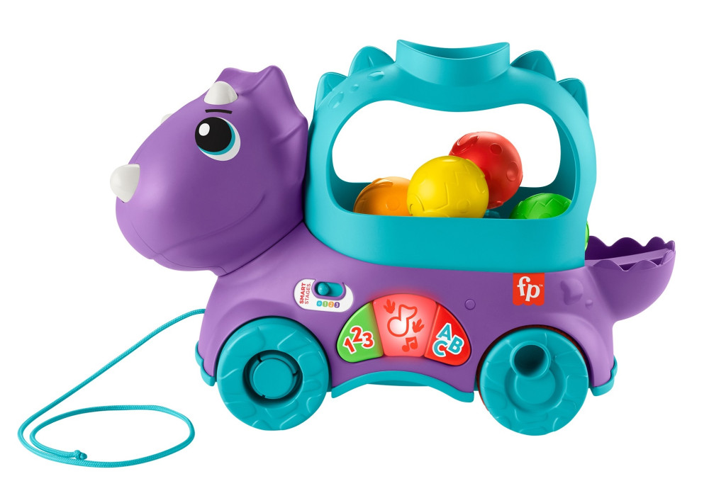 Wybierz się na wesoły spacer z tą zabawką Dinuś Podskakujące piłeczki od Fisher-Price. Wielbiciele dinozaurów mogą popychać lub ciągnąć przyjaznego triceratopsa, aby zobaczyć, jak kolorowe piłeczki podskakują w środku zabawki. Aby zabawa była bardziej angażująca, dzieci mogą naciskać 3 przyciski, aby aktywować edukacyjne treści uczące literek, liczenia, kolorów i kształtów. Naciśnij przycisk globusa, aby wybrać język: polski, węgierski, czeski, słowacki lub angielski. Interaktywny zabawkowy dinozaur do ciągnięcia z podskakującymi piłeczkami, światełkami oraz ponad 40 aktywacjami (piosenki, dźwięki i wypowiedzi) Mali wielbiciele dinozaurów mogą popychać lub ciągnąć triceratopsa, aby zobaczyć podskakujące kolorowe piłeczki oraz aktywowane ruchem światełka i dźwięki 3 poziomy nauki wprowadzają malucha w świat literek, liczenia, kolorów i kształtów. Naciśnij przycisk globusa, aby wybrać język: polski, węgierski, czeski, słowacki lub angielski W zestawie są 4 piłeczki do chwytania i wrzucania do zabawki Pomaga dzieciom od 12 do 36 miesiąca wzmacniać zręczność i sprawność ruchową.