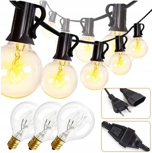 G40 lampki ogrodowa z 30 przezroczystymi żarówkami i 3 zapasowymi żarówkami.Długość całkowita 9,2M.Wykonane z wysokiej jakości szkła o wysokiej przepuszczalności.Światło żarówek emituje delikatny blask i ciepłą atmosferę na spotkanie rodzinne, uroczystość świąteczną, romantyczne wesele, różne imprezy festiwalowe itp.