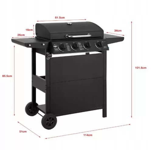 Ten grill gazowy został wyprodukowany zgodnie z wysokimi standardami jakości i jest zgodny ze wszystkimi obowiązującymi normami, aby zapewnić najwyższy możliwy poziom bezpieczeństwa podczas grillowania.Prosta, wysokiej jakości konstrukcja w połączeniu z wysoką funkcjonalnością urządzenia nie pozostawia nic do życzenia i zrobi wrażenie zarówno na właścicielach, jak i gościach, a różnorodne możliwości ustawień tego grilla pozwalają na optymalne ugotowanie każdej potrawyDzięki grillowi gazowemu możesz cieszyć się zdecydowaną przewagą nad grillami węglowymi: wygodą i użytecznością. Na przykład gotowanie jedzenia można rozpocząć w ciągu kilku minut, nie musisz się martwić dymem węglowym, proces gotowania można precyzyjnie kontrolować itp.Urządzenie posiada pojemne półki, dzięki którym wszystkie potrzebne przybory będziesz mieć zawsze pod ręką.Dzięki dwóm dużym kółkom grill można łatwo transportować i bezpiecznie przechowywać w miejscu użytkowania.