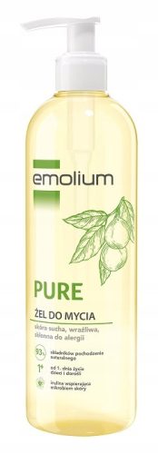 Linia Emolium Pure to kosmetyki wegańskie i hipoalergiczne, oparte na dobroczynnych właściwościach wyciągów i olejów roślinnych. Kosmetyki naturalne Pure są bezzapachowe i przebadane dermatologicznie. Emolium Pure żel do mycia zawiera 93% składników pochodzenia naturalnego wg normy ISO 16128. Formuła żelu jest wegańska i biodegradowalna a opakowanie produktu wykonane jest w 50% z recyklingu.