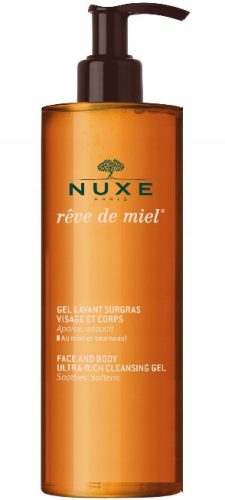 NUXE Rêve de Miel® Ultrabogaty Żel to delikatny preparat oczyszczający, który skutecznie myje twarz i ciało, nie naruszając naturalnej bariery hydrolipidowej skóry. Dzięki zawartości miodu i ekstraktu ze słonecznika, żel odżywia, koi oraz regeneruje skórę, pozostawiając ją miękką i elastyczną. Jego oleista konsystencja w połączeniu z rozkosznym miodowym zapachem sprawia, że każda kąpiel staje się chwilą prawdziwej przyjemności.
