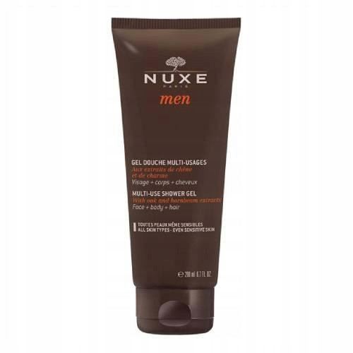 NUXE MEN Żel pod prysznic oparty na bazie myjącej pochodzenia roślinnego, żel pod prysznic o neutralnym pH, zawiera wyciągi z dębu i grabu, w delikatny sposób oczyszcza ciało oraz włosy. Koi, naprawia, chroni i nawilża.