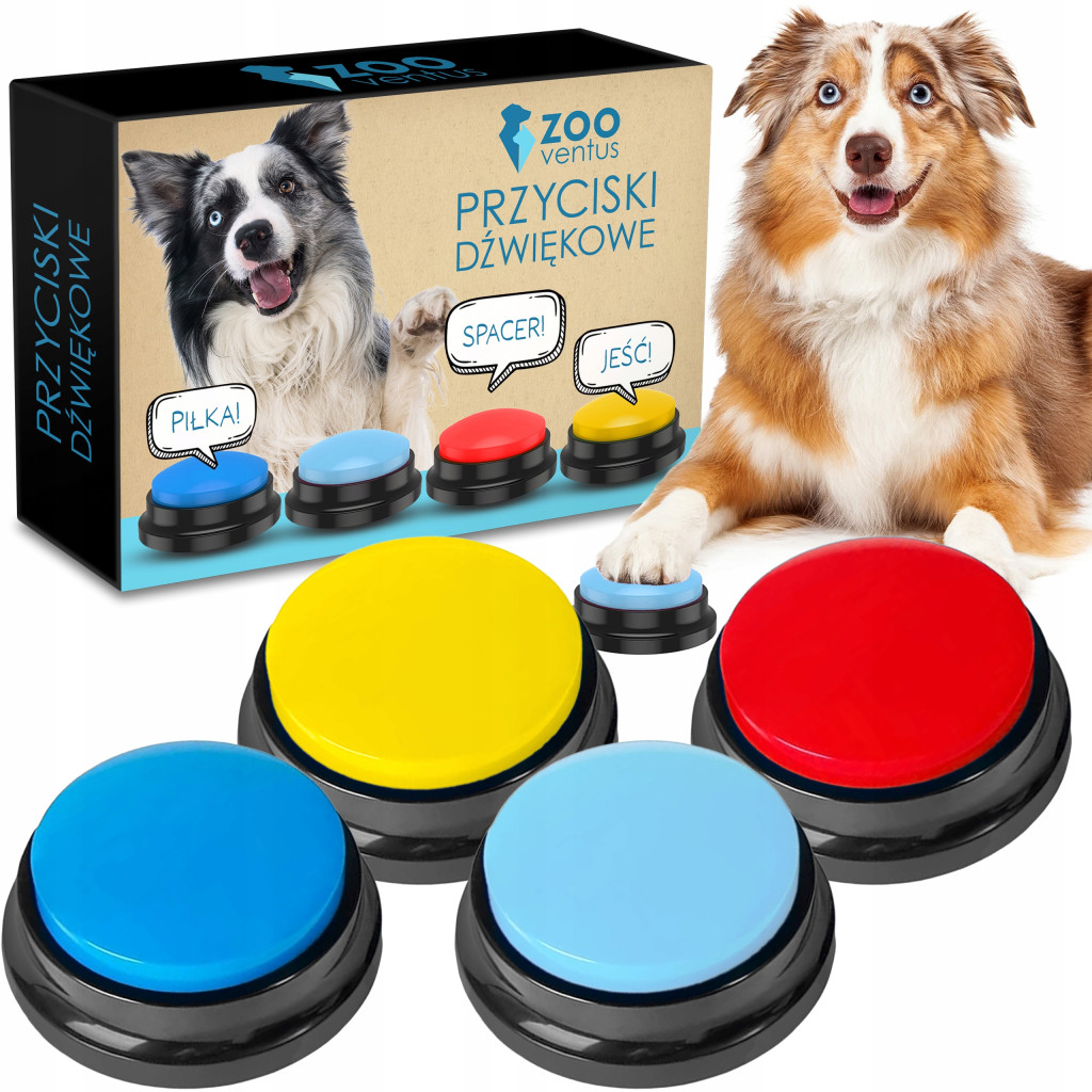 Zestaw 4 przycisków dźwiękowych to nowatorskie rozwiązanie, które pozwoli Ci nawiązać z psem łatwą i intuicyjną komunikację.