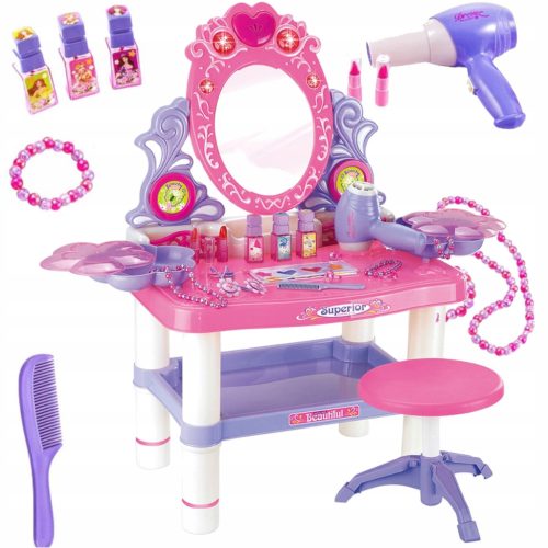 Elementy zestawu Opis Toaletka Estetycznie zaprojektowana toaletka z bezpiecznym lustrem i miejscem do przechowywania akcesoriów. Taboret Wygodne siedzenie dla dziecka, idealne do zabawy przy toaletce. 2 x szminki (imitacja) Bezpieczne imitacje kosmetyków, idealne do zabawy w stylizację. 3 x lakiery do paznokci (imitacja) Kolorowe imitacje lakierów do paznokci, które dodają zabawie realizmu. 1 x korale na szyję Eleganckie korale, które dopełniają każdą stylizację. 2 x korale na rękę Stylowe bransoletki dla małej księżniczki. 3 x pierścionki Piękne pierścionki, które dodają uroku. 1 x grzebyk Grzebyk do czesania i stylizacji włosów. 2 x gumki do włosów Kolorowe gumki, które ułatwiają tworzenie fryzur. 1 x suszarka Funkcjonalna suszarka na baterie, która dmucha powietrzem, dodając zabawie realizmu. 1 x zestaw cieni do malowania z pędzelkiem Imitacje cieni do powiek z pędzelkiem, idealne do zabawy w makijaż.