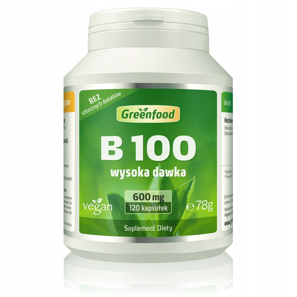B-Kompleks 100 - ekstra wysoka dawkaKapsułki kompleksu Greenfood B100 zawierają wszystkie witaminy z grupy B w dużych dawkach w jednej kapsułce i są również przyjazne dla wegetarian i wegan, ponieważ otoczki kapsułek są wykonane z celulozy roślinnej. Różne witaminy z grupy B zawarte w kompleks Greenfood B według Europejskiej Agencji Bezpieczeństwa Żywności (EFSA) przyczynia się do:•prawidłowego funkcjonowania układu nerwowego (B1, B2, B3, B6, biotyna i B12),•prawidłowych funkcji psychologicznych (B1, B3, Biotyna, B6, B9 i B12),•prawidłowego funkcjonowania układu odpornościowego (B6, B9 i B12),•utrzymanie prawidłowej skóry (B9,B2 i biotyna),•w celu zmniejszenia uczucia zmęczenia i znużenia (B2,B5,B6,B9 i B12).Ilość:Jedna puszka zawiera 120 kapsułek.Dawkowanie:1 kapsułka = wszystkie witaminy z grupy B, wysoka dawkaSposób użycia:Przyjmować 1 kapsułka dziennie dużą ilością wody.Składniki:dwuwinian choliny, otoczka kapsułki: hydroksypropylometyloceluloza, chlorowodorek tiaminy (witamina B1), D-pantotenian wapnia (wapń, kwas pantotenowy), kwas para-aminobenzoesowy, inozytol,nikotynamid (niacyna), ryboflawina (witamina B2), chlorowodorek pirydoksyny (witamina B6), L-metylofolan wapnia (wapń, kwas foliowy), metylokobalamina (witamina B12), D-biotyna (biotyna). •Najwyższa jakość,•Wysoka dawka,•Bez sztucznych dodatków (bez stearynianu magnezu itp.),•Bez GMO,•Kapsułki wegańskie,•Bez laktozy, bezglutenowe