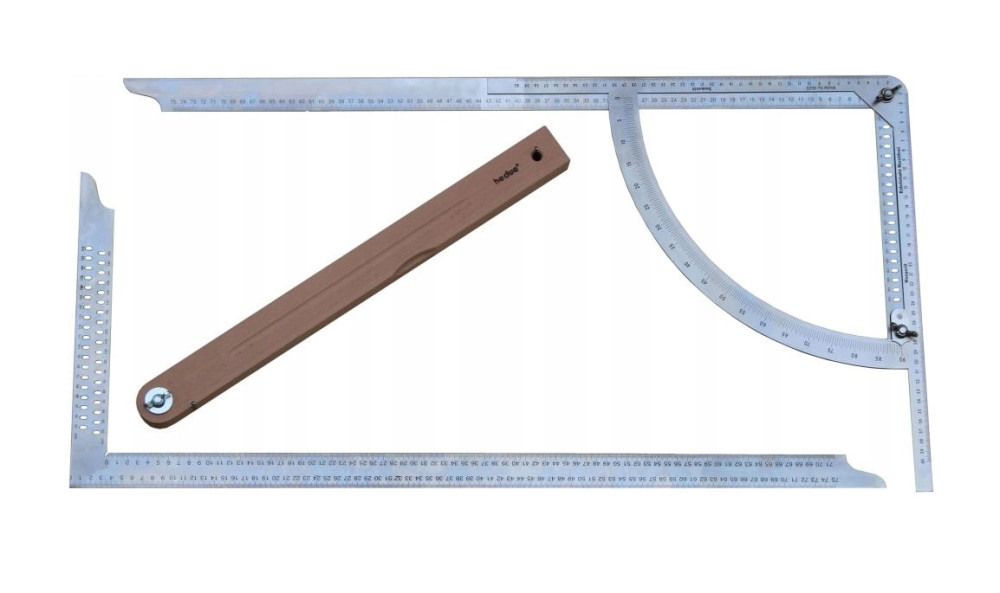 Z nierdzewnej stali nierdzewnej z wytrawioną podziałką stopniową. Kątownik i ćwierćkole zespawane bezspoinowo. Szybkie trasowanie podczas wszelkiego typu prac stolarskich. Precyzyjne trasowanie kulawek, krokwi narożnych i prostych schodów oraz podwójnych wrębów.