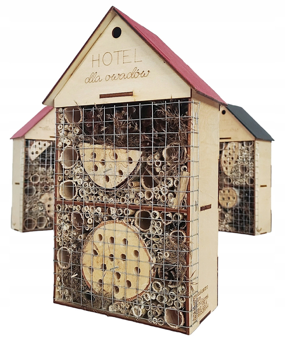 w kształcie chatki, zabezpieczony siatką, która ma dwa zastosowania chroni owady, jaja i larwy przed ptakami oraz zapobiega wysypywaniu się wypełnienia.