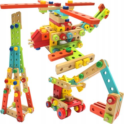 138 elementowy drewniany zestaw konstrukcyjny to idealny prezent dla małego majsterkowicza. Skręcając ze sobą śrubki, listewki, kółka i nakrętki, można w prosty sposób stworzyć wszelkie konstrukcje, jakie tylko podpowie wyobraźnia! Na pewno pomocne okażą się załączone: klucz i śrubokręt. Bezpieczeństwo zabawy gwarantuje wykonanie z wysokiej jakości materiałów oraz wygładzone obrzeża wszystkich elementów. Zabawka posiada atrakcyjną kolorystykę.