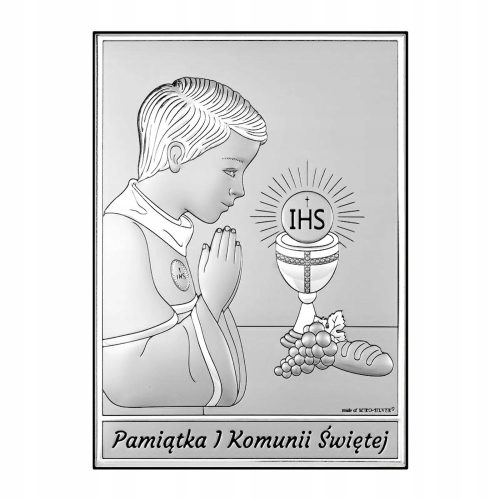 Ekskluzywny srebrny obrazek z grawerem przedstawiający chłopca przystępującego do Pierwszej Komunii Świętej. Obok znajdują się elementy eucharystyczne, takie jak kielich z hostią i winogrono, co nadaje mu religijnego charakteru. Oferujemy możliwość personalizacji, dzięki czemu obrazek będzie unikalny i wyjątkowy. To nie tylko piękna pamiątka, ale także praktyczny przedmiot, który będzie cieszył przez wiele lat. Obrazek jest idealnym prezentem na Pierwszą Komunię Świętą dla chłopca, a na dole znajduje się napis "Pamiątka Pierwszej Komunii Świętej", który podkreśla jego symboliczne znaczenie.