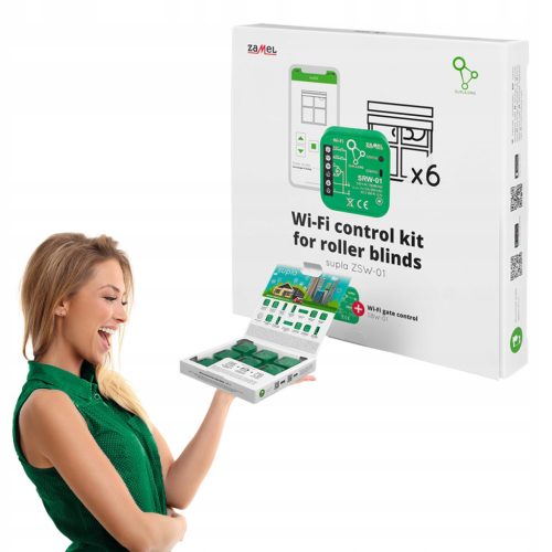 6 sztuk sterowników rolet SRW-01, które pozwalają na sterowanie roletami za pomocą przycisków roletowych oraz bezprzewodowej sieci Wi-Fi. Użytkownik może sprawdzić położenie rolety. Możliwe jest też jej zdalne zamknięcie lub otworzenie. Dzięki zapisanym w chmurze harmonogramom możliwe jest automatyczne sterowanie roletą o określonej godzinie w wybranym dniu tygodnia.