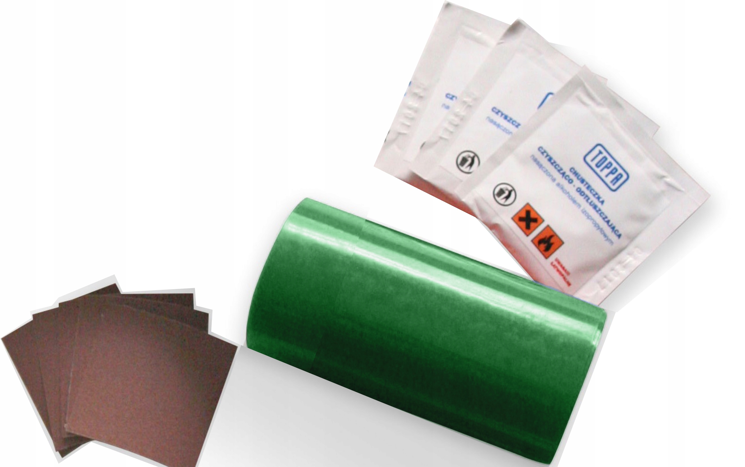 Każdy zestaw zawiera chusteczki odtłuszczające oraz papier ścierny umożliwiające łatwe przygotowanie plandeki do klejenia łaty TOPPA.