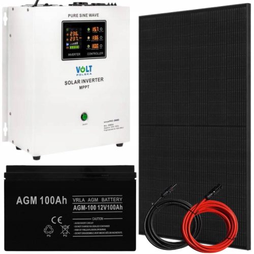 Zestaw fotowoltaiczny oparty na Przetwornicy solarnej SinusPRO-1500S 24V 2000VA SOLAR z wbudowanym regulatorem ładowania MPPT 40A firmy Volt Polska wraz z PANELEM SŁONECZNYM FULL BLACK MONO, akumulatorem 100Ah, przewodami oraz końcówkami do podłączenia, tworzą jedyny w swoim rodzaju
