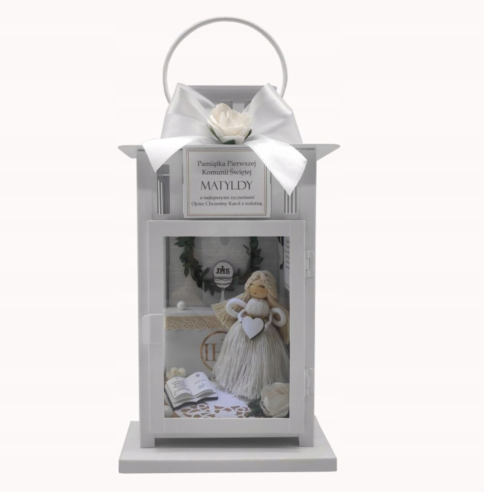 W lampionie jest księga, na której zapisana jest data, oraz nazwa parafii gdzie odbywa się Pierwsza Komunia Święta.