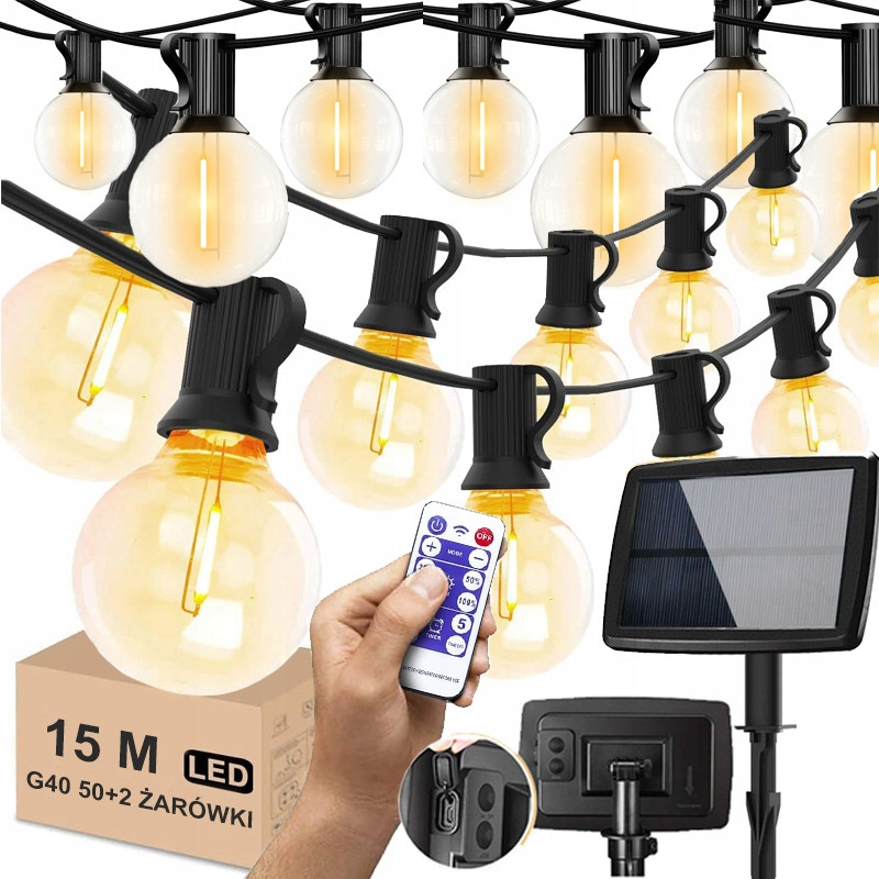 Solarna lampa łańcuchowa zewnętrzna G40 ma 15M długości, 50 sztuk żarówek kulowych.Światła zasilane są energią słoneczną.Żarówki LED o wysokiej wydajności oszczędzają ponad 90% energii w porównaniu z żarówkami.Słoneczne zewnętrzne oświetlenie łańcuchowe automatycznie włącza się w nocy i wyłącza w ciągu dnia.