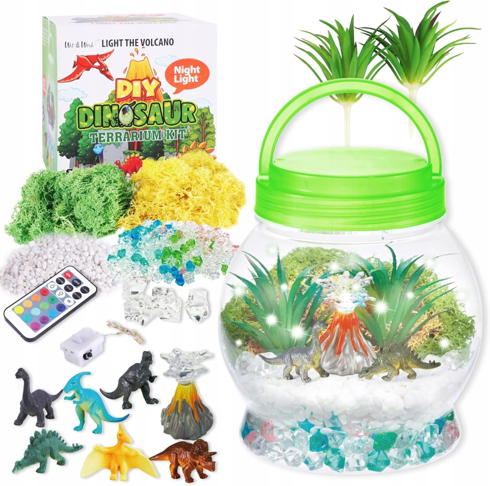 【Zawartość opakowania】 (losowe nowe i stare opakowania) 1 x przezroczysty słoik, 1 x zielony mech, 1 x żółty mech, 2 x sukulenty, 1 x kolorowe kryształy, 1 x białe kamyki, 1 x duże przezroczyste kryształy, 1 x światło LED, 6 x dinozaury, 1 x pilot, 1 x zapal wulkan, 1 x instrukcja, 1 x kartka z życzeniami.
