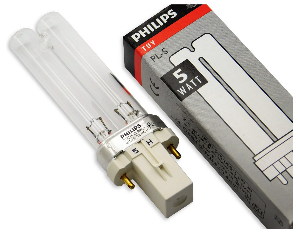 Promiennik nadfioletu Philips TUV PL-S 5W/2P G23, o wyglądzie świetlówki kompaktowej, z 2-pinowym trzonkiem G23.