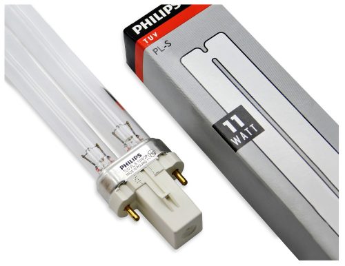 Promiennik nadfioletu Philips TUV PL-S 11W/2P G23, o wyglądzie świetlówki kompaktowej, z 2-pinowym trzonkiem G23.