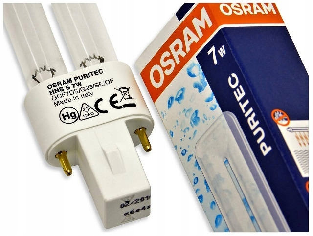 Promiennik nadfioletu Osram Puritec HNS G23 o mocy 7W, o wyglądzie świetlówki kompaktowej, z 2-pinowym trzonkiem G23.