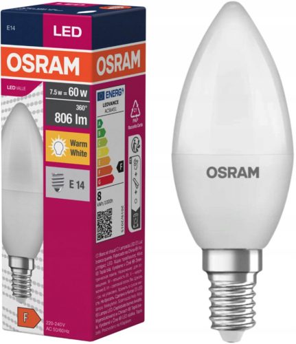 Żarówka LED Osram Value Classic B 60 E14 7.5W Frosted 2700K 806lm zapewnia przyjemne, ciepłe białe światło o temperaturze 2700K, idealne do tworzenia nastrojowego oświetlenia w domu. Dzięki mocy 7,5W zastępuje tradycyjną żarówkę 60W, oferując jasność 806 lumenów przy niskim zużyciu energii.