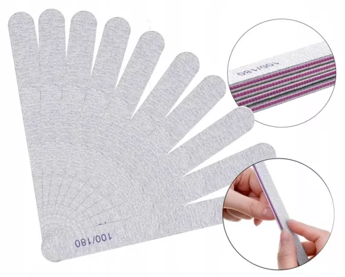 Pilnik średnioziarnisty o gradacji 100/180 przeznaczonej do podstawowej obróbki żelu i akrylu UV oraz paznokci naturalnych.