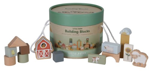 Zestaw klocków Little Farm FSC od Little Dutch. Ten uroczy zestaw klocków został stworzony do rozwijania umiejętności motorycznych dziecka w trakcie zabawy. Dodatkowo stymuluje on koordynację ręka-oko, pobudza kreatywność i doskonale rozwija umiejętności motoryki małej. Komplet składa się z 50 drewnianych klocków w różnych kształtach i rozmiarach, ozdobionych motywem z kolekcji Little Farm i różnymi ilustracjami ze zwierzątkami. Doskonałe do zbudowania własnej farmy! Pięknie zapakowane w estetyczne opakowanie ułatwiające przechowywanie. Zabawka wykonana jest z drewna z certyfikatem FSC i pokryta farbami na bazie wody. Stanowi świetny pomysł na prezent i doskonałe uzupełnienie dla pozostałych zabawek z kolekcji Little Farm od Little Dutch.