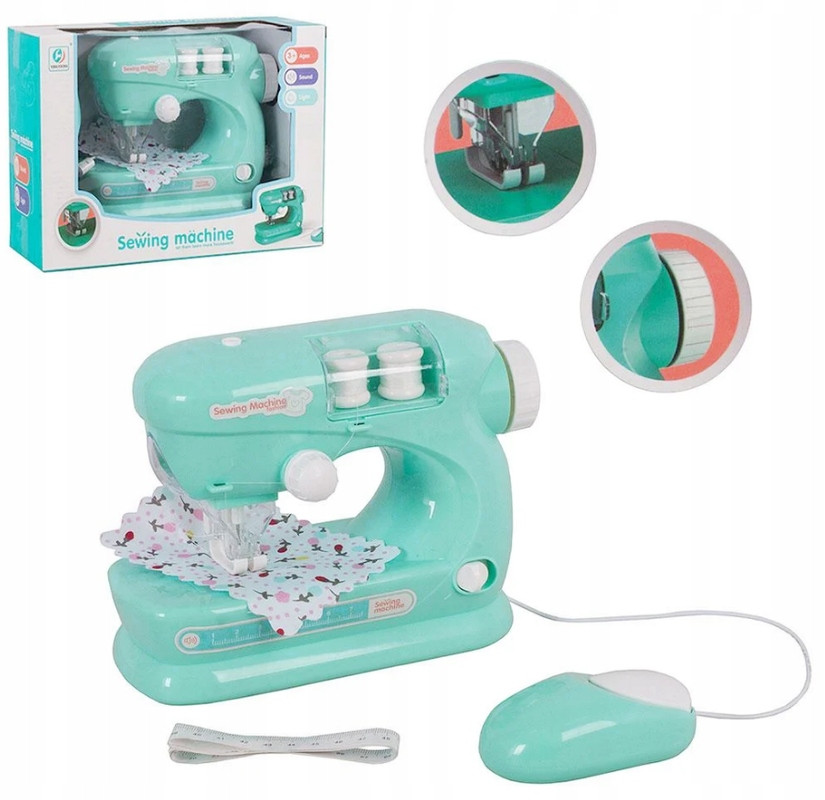 W zestawie zabawkowa maszyna do szycia z osłoną na igłę, 2 szpulki nici, metr krawiecki, skrawek materiału. Powłączeniumaszyna zaczyna szyć oraz uruchamia się wesoła melodyjka i efekty świetlne.
