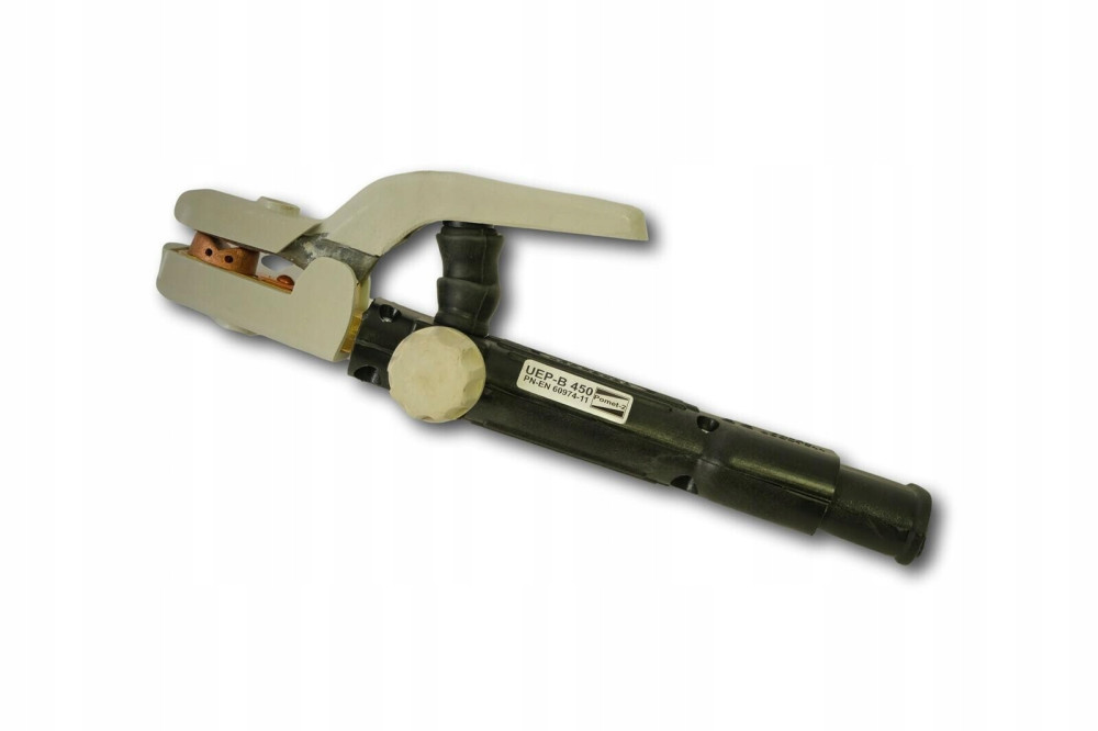 Uchwyt UEP-450 jest całkowicie izolowany. Elektroda zaciskana jest pomiędzy wkładką prądową a dźwignią dociskową. Wkładka prądowa ma możliwość obracania się wokół swej osi. Jako źródło prądu stałego można użyć spawarkę wirującą o natężeniu wtórnym do 500 A. Uchwyt przeznaczony jest do żłobienia elektro-powietrznego okrągłymi elektrodami węglowymi ESM-256 w pozycji podolnej i naściennej. Znajduje szerokie zastosowanie w hutnictwie przy obróbce wlewków, regeneracji dużych elementów, usuwania wadliwych odcinków spoin, ukosowania blach itp. Należy stosować ciśnienie powietrza od 0,3 - 0,8 MPa zależnie od żądanych warunków żłobienia. Elektrodę założyć tak aby jej użyteczna długość wynosiła 150 mm. Spawarkę uruchomić, zajarzyć łuk i prowadzić elektrodę pod kątem 50’ do poziomu żłobionego i rowka, a po upaleniu elektrody do 50 mm żłobienie przerwać i wysunąć ponownie elektrodę na długość 150 mm.