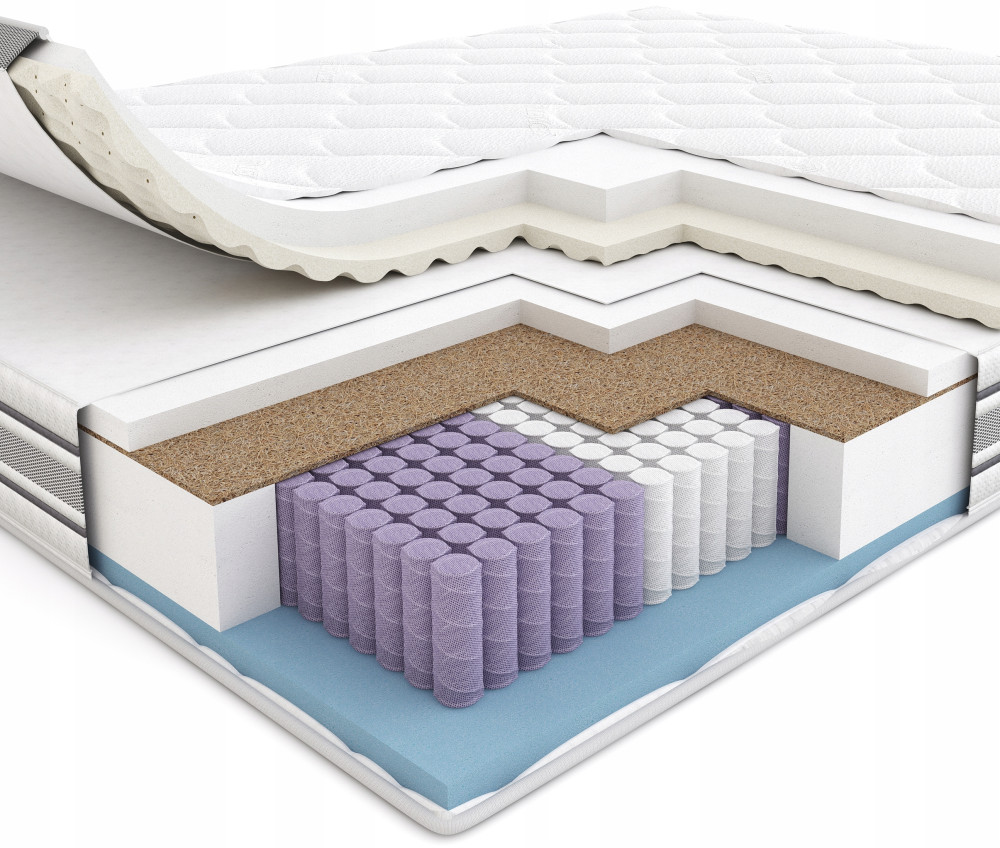 WKŁAD: baza: 7-strefowa sprężyna kieszeniowa Multipocket, po jednej stronie pianka wysokoelastyczna HR o wys. 4 cm, po drugiej stronie pianka hybrydowa Fusion o wys. 3 cm połączona z taflą Sizalu; odpinany TOP: profilowany lateks o wys. 3 cm, pianka termoelastyczna.