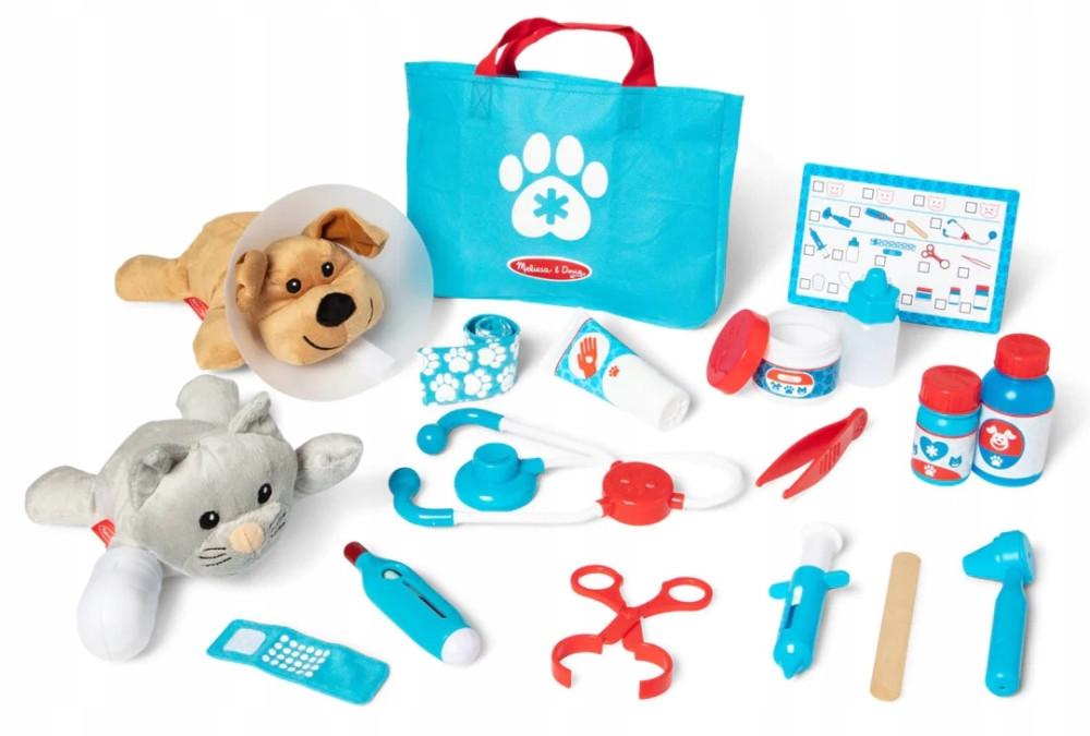Mocną stroną tego zestawu jest jego wszechstronność. Znajdziecie w nim nie tylko zestaw do leczenia zwierząt, ale również torbę do zapakowania i przechowywania oraz dwie maskotki pieska i kotka, którymi od razu można się zaopiekować.