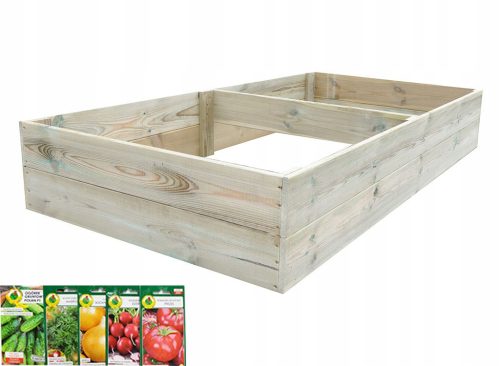 W komplecie: 2 dłuższe boki skręcone, 4 deski (79,5cm), które należy przykręcić do wsporników tworząc boczne ściany oraz 1 deska (79,5cm) do przykręcenia w środku skrzyni tworząca 2 przegrody.