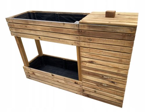 Idealny do uprawy owoców, warzyw, ziół i kwiatów, wykorzystujący odpady do produkcji naturalnego kompostu. Warzywniak z kompostownikiem ma idealny rozmiar do umieszczenia na tarasie lub balkonie. Dwie duże grządki obite agrowłókniną pozwalają na rozpoczęcie siewu odrazu po uzupełnieniu ziemią. Kompostownik z podniesionym dnem nie brudzi miejsca gdzie stoi, natomiast górna pokrywa zapobiega wydobywaniu się nieprzyjemnego zapachu.