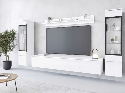 Meble polskiego producenta, starannie wykonane z materiałów najwyższej jakości. Całość wyprodukowana z płyty laminowanej o grubości 15 mm. Fronty wykonane z płyty polygloss 15 mm. Krawędzie oklejone odpornym na ścieranie obrzeżem ABS (tylne krawędzie- obrzeże papierowe). W witrynie szkło hartowane.