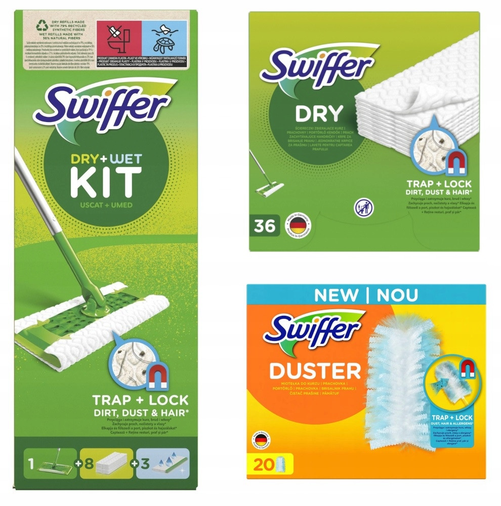 Można używać go do wycierania drobnego kurzu, którego nie udało się usunąć odkurzaczem lub przy doraźnym sprzątaniu, aby uniknąć konieczności częstego, dokładnego czyszczenia. Jak? Dlaczego? Grubość ściereczek oraz ich specjalnie zaprojektowana tekstura w połączeniu z działaniem elektrostatycznym pozwalają zebrać cały kurz i zatrzymać go w tkaninie. Ale to nie wszystko. Po usunięciu kurzu czas umyć podłogę! Zestaw startowy zawiera również 3 mokre chusteczki! Mokre chusteczki do podłóg dokładnie rozpuszczają brud i zanieczyszczenia, a następnie wchłaniają je, pozostawiając świeży zapach czystości. Co więcej, obrotowa końcówka 360° mopa Swiffer pozwala dokładnie wyczyścić cały dom, w tym trudno dostępne miejsca, takie jak powierzchnie pod lodówką, kuchenką czy zmywarką, pod łóżkami, kanapami, a także w rogach i zakamarkach, do których zwykłe szczotki do zamiatania i mopy nie są w stanie dotrzeć. Czy to nie wspaniałe?