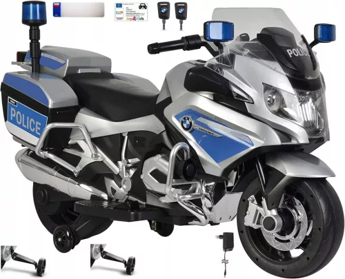 Policyjny motor BMW R1200 RT zwraca na siebie uwagę już z dużej odległości. W jego konstrukcji zamieszczono białe i niebieskie światła LED, które znajdują się w przedniej części konstrukcji i na kierownicy, a także z tyłu pojazdu oraz w formie koguta policyjnego — uważamy, że włączenie ich sprawi, że każdy mały kierowca poczuje się jak prawdziwy policjant, a jego bezpieczeństwo i widoczność na drodze zostaną podniesione do najwyższego stopnia. Kolejnym udogodnieniem, stanowiącym dużą pomoc zwłaszcza dla najmłodszych kierowców, jest połączenie konstrukcji motorka z bocznymi kółkami, ułatwiającymi utrzymanie równowagi podczas jazdy.