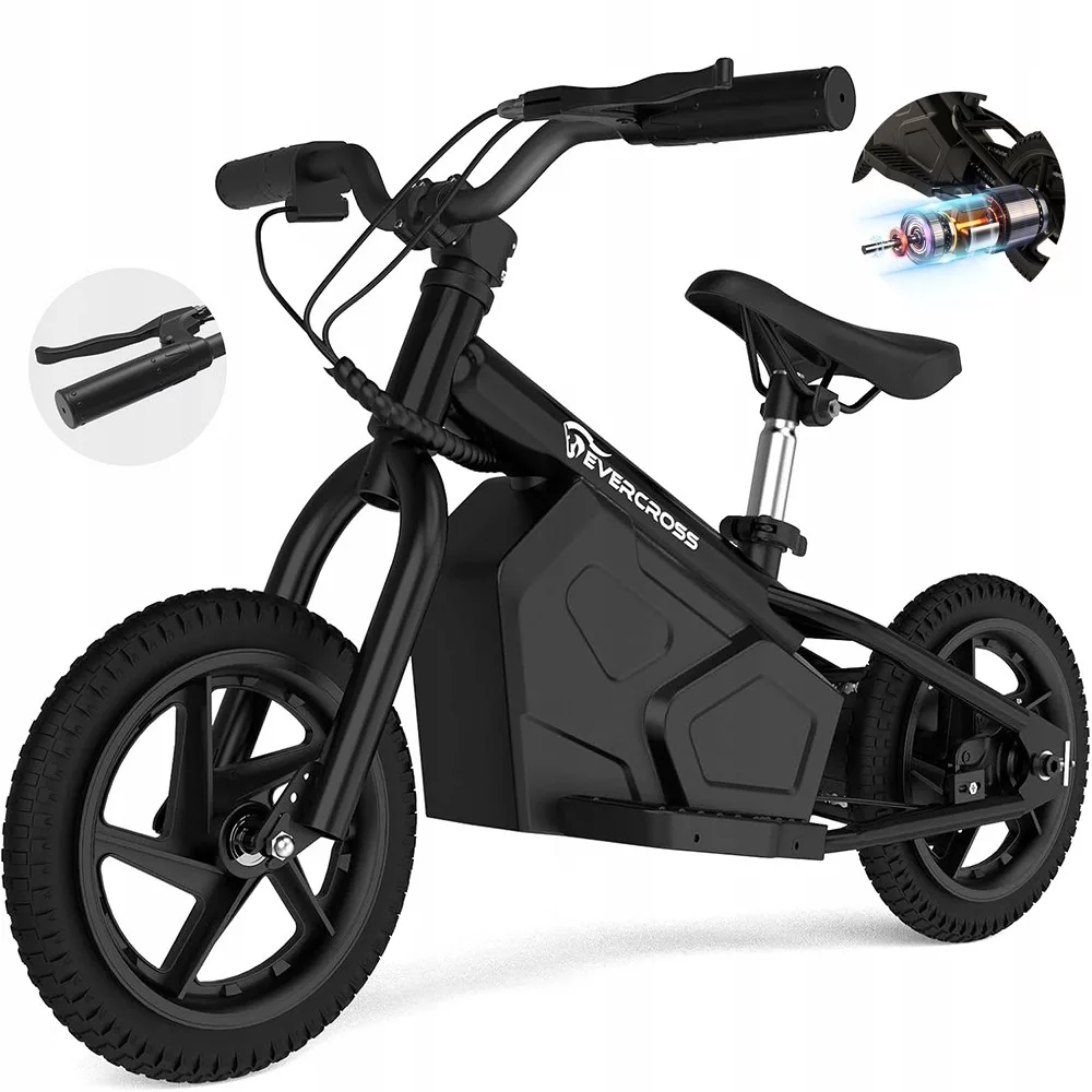 Dziecięcy rower elektryczny EVERCROSS EV06M jest wyposażony w silnik 24V 100W i akumulator litowy 4AH. Maksymalna prędkość wynosi 15 km/hi może z napędu przejechać 10 km (powyższe wartości mogą wystąpić w wyniku warunków jazdy, skutków, warunków i skutków utrzymania).