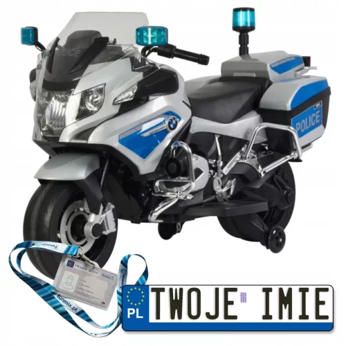 Duży, policyjny motor na akumulator to propozycja dla dzieci od 3-go roku życia. Będzie spełnieniem marzeń Twojego dziecka, bo przecież który mały chłopiec nie marzy o tym by w przyszłości zostać policjantem. Elektryczny motor policyjny wykonany został na licencji BMW, która gwarantuje solidność, trwałość i idealne odwzorowanie. Niesamowity elektryczny motorek policyjny wyposażono w mocny silnik RC-550SMP/12V, 10500RPM oraz akumulator 12V/7Ah. Odpalany jest za pomocą kluczyka, posiada wolny start oraz 3 szybkości, jeździ zarówno do przodu jak i do tyłu. Bogate oświetlenie, światła LED z przodu, światła policyjne w lusterkach oraz kogut policyjny z tyłu pojazdu. Jazdę policyjnym motorem dl dzieci umilą dźwięki z panelu audio, pięć przycisków z melodiami, odgłosami, syrenami. Piankowe, duże koła EVA gwarantują cichą i komfortową jazdę, a dodatkowe kółka pomocnicze znacząco wpływają na bezpieczeństwo Twojego dziecka podczas jazdy.