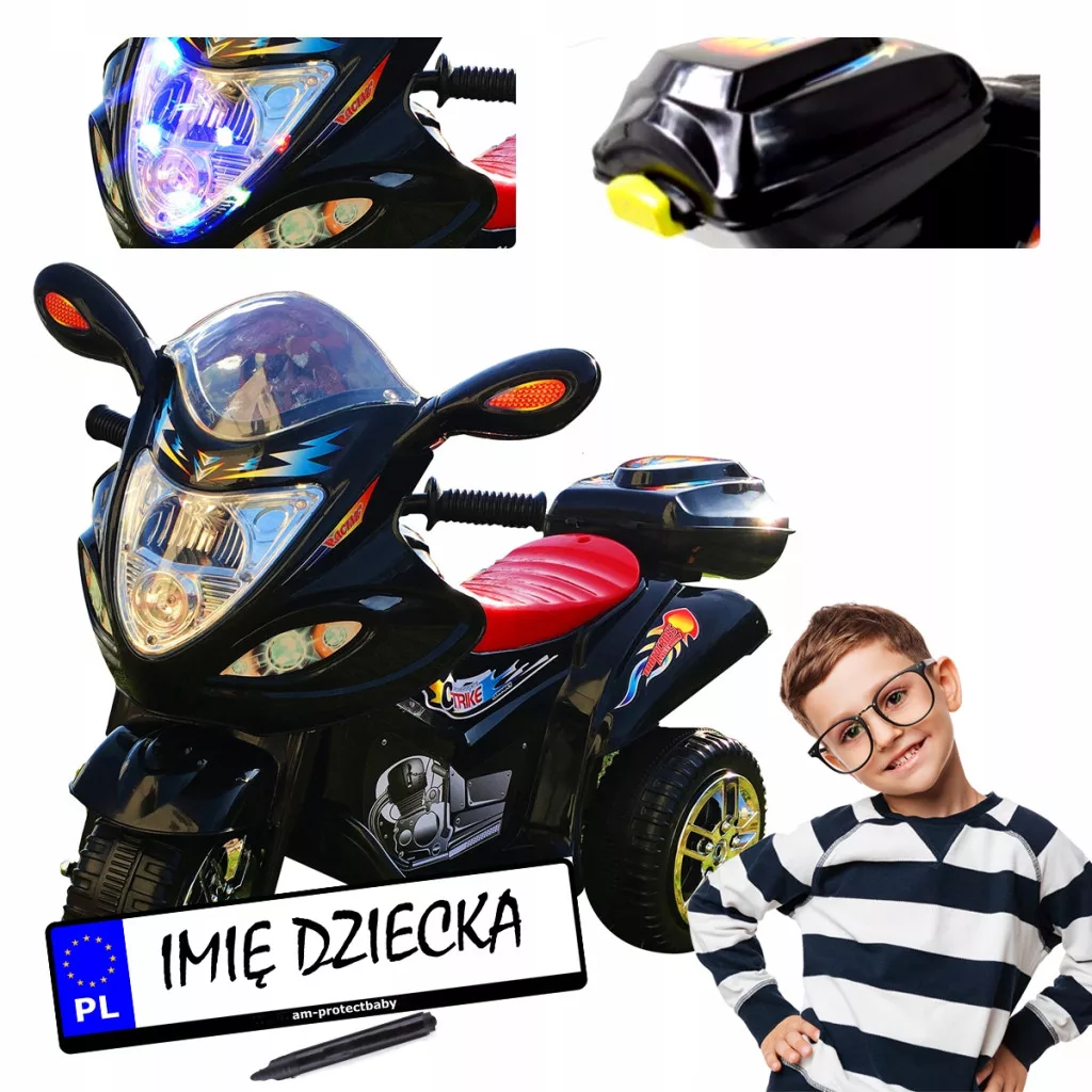 Kupując Motorek otrzymujesz GRATIS Radość dziecka, Zmywalną tablicę rejestracyjną, Marker i Bezpieczną zabawę.