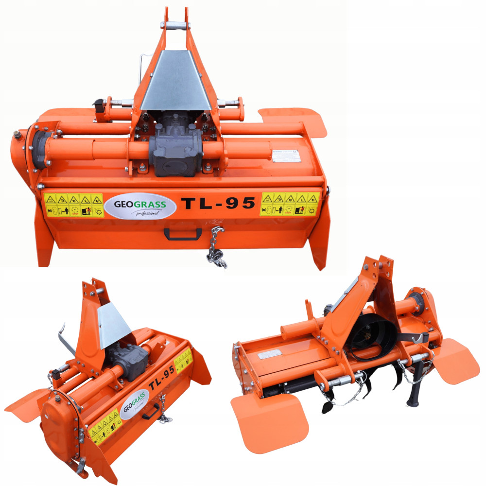 GLEBOGRYZARKA marki GEOGRASS z serii TL (model TL 95) została wyposażona w 16 bocznie wygiętych masywnych noży, umieszczonych po 4 sztuki w jednej sekcji. Posiada 3-punktowe mocowanie do traktora, przekładnie kątową i łańcuch wyposażony w napinacz.